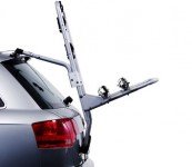 Razširljiv nosilec za pritrjevanje na zadnja vrata v dvignjenem položaju. Ima snemljiva in enostavno pomična držala za okvir. Prtljažnik za kolesa dopolnjujemo s posebnim pritrdilnim delom KIT tako, da ustreza številnim modelom vozil, nosi dve kolesi. Tretje in četrto kolo pa lahko nanj pritrdimo z uporabo adapterjev (973-23, 973-24), če to dopušča Thule Fit Guide. Zložljiv za lažje shranjevanje in ravnanje. Prtljažnik za kolesa velikokrat lahko uporabljate tudi po zamenjavi vozila (morda bo potreben nov pritrdilni del KIT). Vozilo bo ob tem vedno zaščiteno, saj so vsi deli, ki so v stiku z vozilom in kolesi, še dodatno prevlečeni z gumo. Za seznam vozil, ki jim ustreza, glej Thule Fit Guide na www.thule.com.